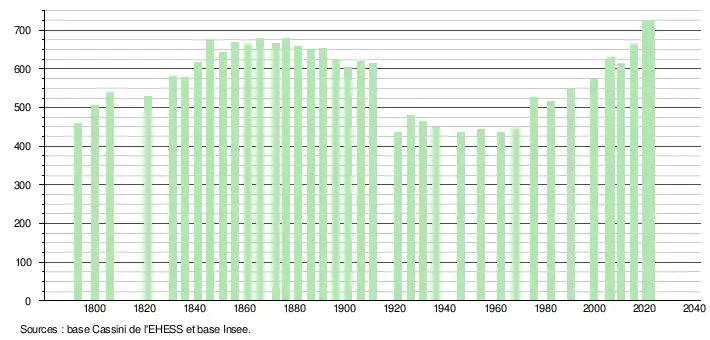 L'évolution du nombre d'habitants est connue à travers les recensements de la population effectués dans la commune depuis 1793. Pour les communes de moins de 10 000 habitants, une enquête de recensement portant sur toute la population est réalisée tous les cinq ans, les populations de référence des années intermédiaires étant quant à elles estimées par interpolation ou extrapolation[33]. Pour la commune, le premier recensement exhaustif entrant dans le cadre du nouveau dispositif a été réalisé en 2005[34].