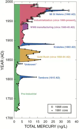 97. (en) Helen M. Amos, Daniel J. Jacob, David G. Streets et Elsie M. Sunderland, « Legacy impacts of all-time anthropogenic emissions on the global mercury cycle », Global Biogeochemical Cycles, vol. 27, no 2, , p. 410–421 (ISSN 0886-6236, DOI 10.1002/gbc.20040, lire en ligne, consulté le ).
