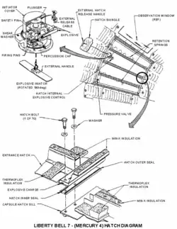 Les ingénieurs de la firme McDonnell proposent deux solutions à l'ouverture rapide des écoutilles de la capsule Mercury : la première, utilisant des loquets, est utilisée pour les vols MR-2 et MR-3 (celui de Shepard) mais elle alourdit de 31 kg le poids de l'ensemble, ajout considéré trop grand pour un vol orbital. La seconde solution, qui consiste en une écoutille explosive, est testée pour le vol de Grissom. Ce concept nécessite les 70 boulons de l'ensemble originel. Chacun des boulons de titane de 6,35 mm est perforé d'un trou de 1,5 mm pour y placer un point de faiblesse. Un fusible détonant léger est installé dans un canal sur tout le pourtour de l'écoutille, entre les sceaux interne et externe d'étanchéité de l'écoutille. Lorsque le fusible est sous tension, la pression entre les joints d'étanchéité interne et externe occasionne le bris des boulons sous tension. Il y a ensuite deux façons d'activer l'écoutille explosive. L'intérieur de l'écoutille contient un piston de crête. Le pilote peut alors enlever une goupille de sécurité et appliquer une pression de 25 N sur le piston, ce qui provoque l'explosion de la charge et la cisaille des 70 boulons, propulsant l'écoutille à 25 pieds (7,6 m) de distance en une seconde. Si la goupille est laissée en place, une force de 180 N est nécessaire à la détonation de la charge. De l'extérieur, le système peut être engagé en enlevant un petit panneau et en tirant sur une corde. L'écoutille explosive ne pèse que 10,43 kg.
