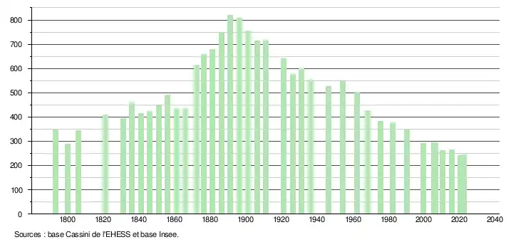 L'évolution du nombre d'habitants est connue à travers les recensements de la population effectués dans la commune depuis 1793. Pour les communes de moins de 10 000 habitants, une enquête de recensement portant sur toute la population est réalisée tous les cinq ans, les populations de référence des années intermédiaires étant quant à elles estimées par interpolation ou extrapolation[16]. Pour la commune, le premier recensement exhaustif entrant dans le cadre du nouveau dispositif a été réalisé en 2005[17].