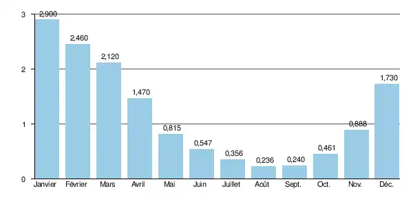 Le débit instantané maximal enregistré a été de 20,5 m3/s le , tandis que la valeur journalière maximale était de 17 m3/s le . Si l'on compare la première de ces valeurs à l'échelle des QIX exposée plus haut, l'on constate que cette crue n'était même pas d'ordre décennal, et donc destinée à se reproduire fréquemment.