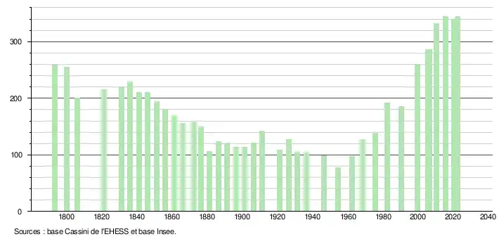 L'évolution du nombre d'habitants est connue à travers les recensements de la population effectués dans la commune depuis 1793. Pour les communes de moins de 10 000 habitants, une enquête de recensement portant sur toute la population est réalisée tous les cinq ans, les populations de référence des années intermédiaires étant quant à elles estimées par interpolation ou extrapolation[28]. Pour la commune, le premier recensement exhaustif entrant dans le cadre du nouveau dispositif a été réalisé en 2005[29].