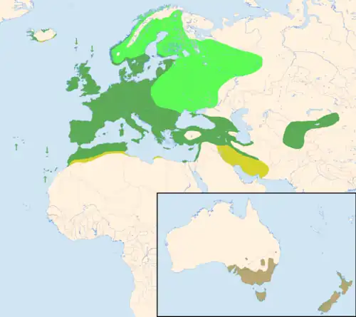 Le merle niche en Europe, Asie et Afrique du Nord, et a été introduit en Australie et en Nouvelle-Zélande. Il existe plusieurs sous-espèces de Merle noir sur sa vaste aire de répartition dont certaines, asiatiques, sont considérées par certains auteurs comme des espèces à part entière. Selon la latitude, le Merle noir peut être sédentaire ou migrateur, partiellement ou entièrement.
