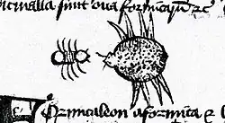 Enfin, un manuscrit du Xe siècle, le récit des voyages de Gervais de Tilbury puis le Bestiaire divin de Guillaume le Clerc de Normandie viennent s’ajouter aux rares écrits décrivant le mermecolion[5].