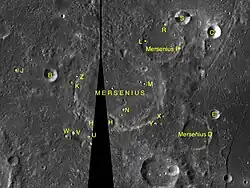 Par convention, les cratères satellites sont identifiés sur les cartes lunaires en plaçant la lettre sur le côté du point central du cratère qui est le plus proche de Mersenius.