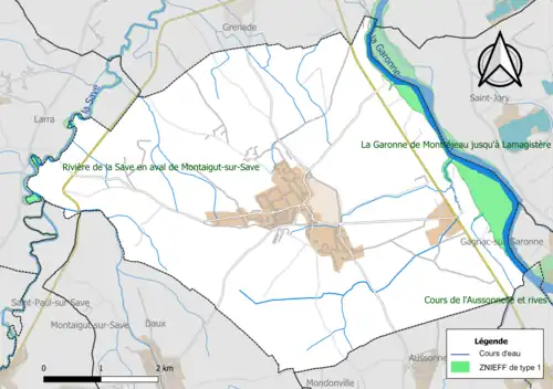 L’inventaire des zones naturelles d'intérêt écologique, faunistique et floristique (ZNIEFF) a pour objectif de réaliser une couverture des zones les plus intéressantes sur le plan écologique, essentiellement dans la perspective d’améliorer la connaissance du patrimoine naturel national et de fournir aux différents décideurs un outil d’aide à la prise en compte de l’environnement dans l’aménagement du territoire. Deux ZNIEFF de type 1[Note 3] sont recensées sur la commune[24] : « la Garonne de Montréjeau jusqu'à Lamagistère » (5 075 ha), couvrant 92 communes dont 63 dans la Haute-Garonne, trois dans le Lot-et-Garonne et 26 dans le Tarn-et-Garonne[25] et la « rivière de la Save en aval de Montaigut-sur-Save » (94 ha), couvrant 6 communes dont cinq dans la Haute-Garonne et une dans le Tarn-et-Garonne[26] et une ZNIEFF de type 2[Note 4],[24] : « la Garonne et milieux riverains, en aval de Montréjeau » (6 874 ha), couvrant 93 communes dont 64 dans la Haute-Garonne, trois dans le Lot-et-Garonne et 26 dans le Tarn-et-Garonne[27].