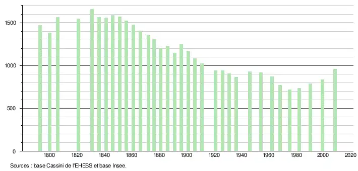 L'évolution du nombre d'habitants est connue à travers les recensements de la population effectués dans la commune depuis 1793. À partir du , les populations légales des communes sont publiées annuellement dans le cadre d'un recensement qui repose désormais sur une collecte d'information annuelle, concernant successivement tous les territoires communaux au cours d'une période de cinq ans. Pour les communes de moins de 10 000 habitants, une enquête de recensement portant sur toute la population est réalisée tous les cinq ans, les populations légales des années intermédiaires étant quant à elles estimées par interpolation ou extrapolation[11]. Pour la commune, le premier recensement exhaustif entrant dans le cadre du nouveau dispositif a été réalisé en 2008[12],[Note 2].