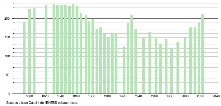 L'évolution du nombre d'habitants est connue à travers les recensements de la population effectués dans la commune depuis 1793. Pour les communes de moins de 10 000 habitants, une enquête de recensement portant sur toute la population est réalisée tous les cinq ans, les populations de référence des années intermédiaires étant quant à elles estimées par interpolation ou extrapolation[25]. Pour la commune, le premier recensement exhaustif entrant dans le cadre du nouveau dispositif a été réalisé en 2007[26].
