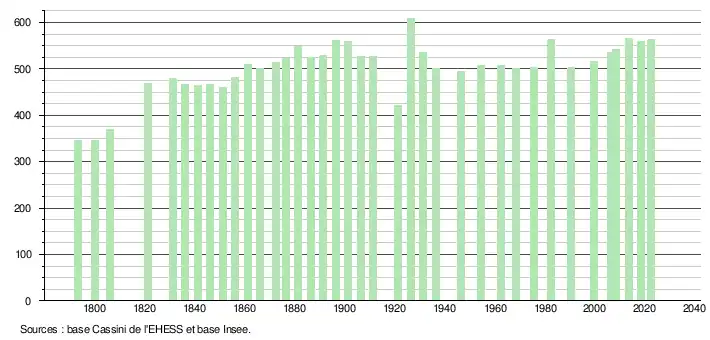 L'évolution du nombre d'habitants est connue à travers les recensements de la population effectués dans la commune depuis 1793. Pour les communes de moins de 10 000 habitants, une enquête de recensement portant sur toute la population est réalisée tous les cinq ans, les populations de référence des années intermédiaires étant quant à elles estimées par interpolation ou extrapolation[28]. Pour la commune, le premier recensement exhaustif entrant dans le cadre du nouveau dispositif a été réalisé en 2008[29].