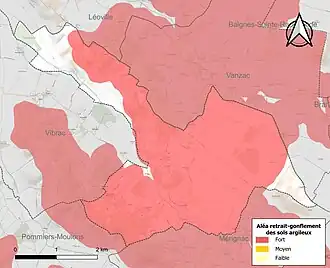 Le retrait-gonflement des sols argileux est susceptible d'engendrer des dommages importants aux bâtiments en cas d’alternance de périodes de sécheresse et de pluie. 84 % de la superficie communale est en aléa moyen ou fort (54,2 % au niveau départemental et 48,5 % au niveau national). Sur les 73 bâtiments dénombrés sur la commune en 2019, 66 sont en aléa moyen ou fort, soit 90 %, à comparer aux 57 % au niveau départemental et 54 % au niveau national. Une cartographie de l'exposition du territoire national au retrait gonflement des sols argileux est disponible sur le site du BRGM[11],[Carte 2].