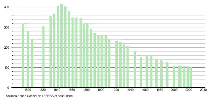 L'évolution du nombre d'habitants est connue à travers les recensements de la population effectués dans la commune depuis 1793. Pour les communes de moins de 10 000 habitants, une enquête de recensement portant sur toute la population est réalisée tous les cinq ans, les populations de référence des années intermédiaires étant quant à elles estimées par interpolation ou extrapolation[14]. Pour la commune, le premier recensement exhaustif entrant dans le cadre du nouveau dispositif a été réalisé en 2008[15].