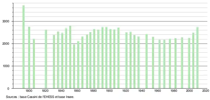 - ↑ Par convention dans Wikipédia, le principe a été retenu de n’afficher dans le tableau des recensements et le graphique, pour les populations légales postérieures à 1999, que les populations correspondant à une enquête exhaustive de recensement pour les communes de moins de 10 000 habitants, et que les populations des années 2006, 2011, 2016, etc. pour les communes de plus de 10 000 habitants, ainsi que la dernière population légale publiée par l’Insee pour l'ensemble des communes.