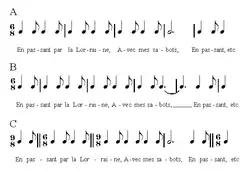 En guise d'exemple, le motif initial de la chanson En passant par la Lorraine. Cette chanson traditionnelle évoque un rythme de marche : il peut donc être supposé qu'elle nécessite une notation de type « mesure à deux (ou quatre) temps ». Cependant, le texte du motif intéressant comporte trois accents toniques, respectivement placés sur les syllabes sant, rai et bots : il serait donc souhaitable que ces trois syllabes accentuées coïncident avec les temps forts de la mesure choisie. Or, on remarque dans les trois exemples ci-dessous que le début de cette chanson peut être noté de différentes manières selon la priorité donnée à l'identité de la mesure, ou au placement exact des accents toniques sur les temps forts.