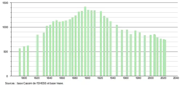 L'évolution du nombre d'habitants est connue à travers les recensements de la population effectués dans la commune depuis 1793. Pour les communes de moins de 10 000 habitants, une enquête de recensement portant sur toute la population est réalisée tous les cinq ans, les populations de référence des années intermédiaires étant quant à elles estimées par interpolation ou extrapolation[16]. Pour la commune, le premier recensement exhaustif entrant dans le cadre du nouveau dispositif a été réalisé en 2005[17].