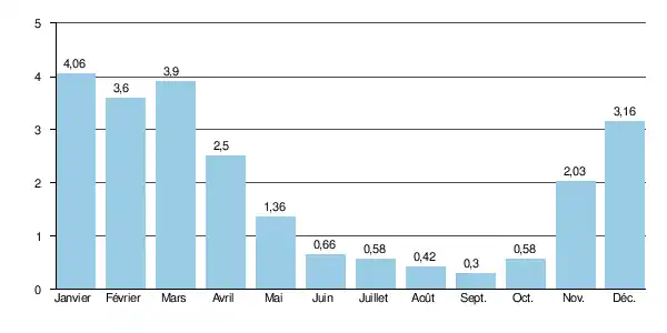 Le débit instantané maximal enregistré a été de 34,9 m3/s le , tandis que la valeur journalière maximale était de 34,0 m3/s le [2].