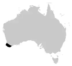 Cette espèce est endémique du Sud-Ouest de l'Australie-Occidentale. Elle se rencontre jusqu'à 800 m d'altitude entre Dunsborough et Albany[1],[2].