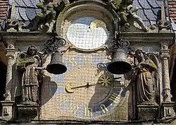 Le premier étage, accessible par un double escalier, est agrémenté d'une galerie dont la balustrade est ouvragée en pierre. L'escalier est surmonté d'une tourelle Renaissance, datée de 1607, et ornée d'une horloge à jacquemarts. Deux angelots de pierre y sonnent les heures et les quarts d'heure. Cette façade, tournée vers la place, affirmait le caractère de prestige de l'édifice en rapport avec l'importance de la corporation qu'il représentait. Le premier étage avait des fonctions de représentation, la corporation y tenant des réunions et des banquets[2],[1].