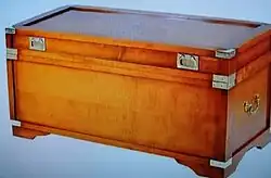 - Le bois : l’artisan choisit un bois robuste, résistant aussi bien aux multiples manipulations qu’aux intempéries maritimes. À partir du XVIIe siècle, les bois exotiques ramenés des colonies s’avèrent, comme pour le meuble de port, être la matière idéale ; robuste, imputrescible, esthétique, d’entretien facile.