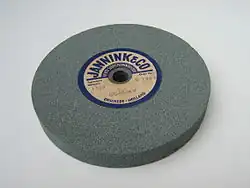 - Un agglomérant pour lier les particules d’abrasif entre elles. La répartition des particules abrasives doit être régulière, de telle manière que la meule présente la plus grande homogénéité possible. Cet agglomérant n’exerce aucune action abrasive, mais c’est de sa nature que dépend la résistance de la meule au travail, aux chocs et à tout effort de rupture. Il peut être de différentes natures :
