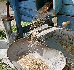- L'épierreur sert à enlever les pierres du lot de blé. Pour cela on fait passer le blé sur un tamis à coussin d'air (le souffle étant réglé pour que le blé soit soulevé). Celui-ci est donc poussé vers la sortie alors que les pierres, ayant une masse volumique plus importante, remontent par à-coups dus à un mouvement rotatif jusqu'à une goulotte d'évacuation des déchets. L'épierreur repose donc sur le principe de séparation des produits par densité.
