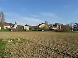 Châteaux. La commune compte sur son territoire deux châteaux : le château (parfois appelé le château d'En-Haut) du XVIe siècle et le château d'En-Bas du XVIIe siècle[19]. Situé au centre du village, le château d'En-Haut construit au XVIe siècle a été agrandi vers 1650 pour Jean-François de Charrière, seigneur de Penthaz. Donnant sur le parc, sa façade principale à trois étages de galeries est encadrée par deux tours[20].