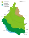 À l'origine, une grande partie de la vallée se trouvait sous les eaux du lac Texcoco, un système de lacs salés et d'eau douce interconnectés. Les Aztèques ont construit des digues pour séparer l'eau douce utilisée pour les cultures dans les chinampas ("jardins flottants" ou îles artificielles pour l'agriculture)[41] et pour prévenir les inondations récurrentes. Ces digues ont été détruites lors du siège de Tenochtitlan et, à l'époque coloniale, les Espagnols ont régulièrement asséché le lac pour prévenir les inondations. Il ne reste qu'une petite partie du lac d'origine, située à l'extérieur de la ville de Mexico, dans la municipalité d'Atenco, dans l'État de Mexico.