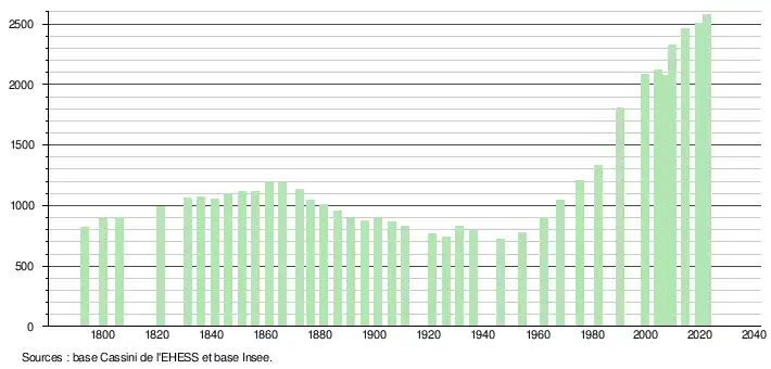 L'évolution du nombre d'habitants est connue à travers les recensements de la population effectués dans la commune depuis 1793. Pour les communes de moins de 10 000 habitants, une enquête de recensement portant sur toute la population est réalisée tous les cinq ans, les populations de référence des années intermédiaires étant quant à elles estimées par interpolation ou extrapolation[26]. Pour la commune, le premier recensement exhaustif entrant dans le cadre du nouveau dispositif a été réalisé en 2004[27].