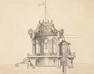 En 1768, le marquis de Marigny qui, quatre ans auparavant, avait hérité de sa sœur le domaine de Ménars, lui demanda confidentiellement – parallèlement à plusieurs de ses collègues parmi lesquels Charles De Wailly et Nicolas Marie Potain – des dessins pour un belvédère chinois pour le lieu-dit Rond-de-Cour dans les jardins du château de Menars[10].