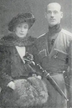 Le grand-duc Michel, commandant de la Division sauvage caucasienne, vêtu de la tcherkeska (longue veste portée par les Caucasiens ou les Cosaques du Kouban et du Terek), avec son épouse, la comtesse Brassova, née Natalia Sergueïevna Chremetievskaïa.