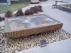 « La Terre est représentée par la surface quadrillée des longitudes et des latitudes d'un planisphère. Les continents de bronze, déformés par cette mise à plat, flottent sur une eau claire qui n'est pas sans faire signe à la mémoire de la place Roy, où s'abreuvaient autrefois les chevaux. Les chaises orientées dans toutes les directions perdent leur fonction traditionnelle, obligeant le spectateur à repenser ses relations avec le monde. »