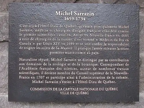 - Une plaque sur le mur extérieur de l'hôtel-Dieu de Québec[36] rappelle Sarrazin ; il y est dit qu'il est « considéré comme le premier scientifique canadien[12] ».