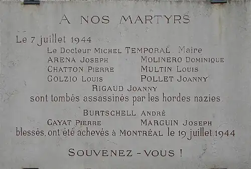 - ↑ « Un hommage rendu aux fusillés du 7 juillet 1944 », sur leprogres.fr, Le Progrès, : « Le cortège s’est rassemblé devant la mairie pour partir, à 18 h 30, de la rue de la Grenette. ».
