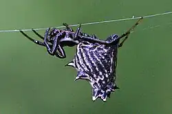 Les mâles sont très différents des femelles, le dimorphisme sexuel est fort. Ils sont généralement deux fois plus petits que les femelles, ils ont moins d'épines, leur abdomen est plus plat et leur teinte plus claire[6]. Même si les mâles produisent de la soie, elle est principalement utilisée dans le rituel d'accouplement.