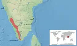 Cette espèce est endémique d'Inde[1]. Elle se rencontre au Tamil Nadu dans le district de Tirunelveli et au Kerala dans le district de Thiruvananthapuram entre 200 et 1 000 m d'altitude dans les Ghâts occidentaux[1],[2],[3].
