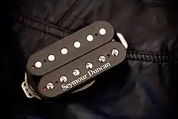 Les micros à double bobinage, aussi appelés micros doubles ou humbuckers, associent deux bobinages câblés avec inversion de polarité des aimants et des bobines[8]. Les deux bobines sont câblées en série[8] (ou, plus rarement, en parallèle[9]) en opposition de phase. De cette manière, les perturbations électromagnétiques, qui ne dépendent pas de la polarité des aimants, s'annulent, tandis que les signaux que produit la vibration des cordes dans les deux micros s'ajoutent[8]. Cela fournit un signal généralement plus puissant qu'un micro à simple bobinage[9]. Le son d'un humbucker est décrit comme « chaud » et « moelleux »[7]. Les deux bobines d'un micro double produisent en effet deux fréquences de résonance rapprochées[7].