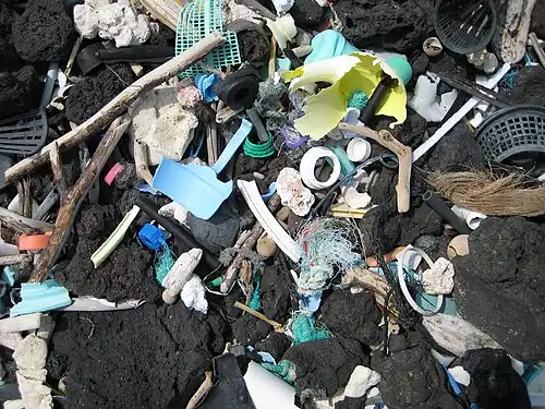Un grand nombre de jouets en plastique (ou leur morceaux) finissent en mer, et parfois dans l'estomac d'oiseaux marins qui en meurent (albatros notamment, voir ci-dessous).