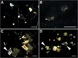 On distingue les microplastiques primaires et secondaires. Ces derniers sont issus de la dégradation de plus grands morceaux de plastiques sous l'effet conjugué de l'oxygène, des UV, de la chaleur, d'actions mécaniques ou de l'activité biologique[28].