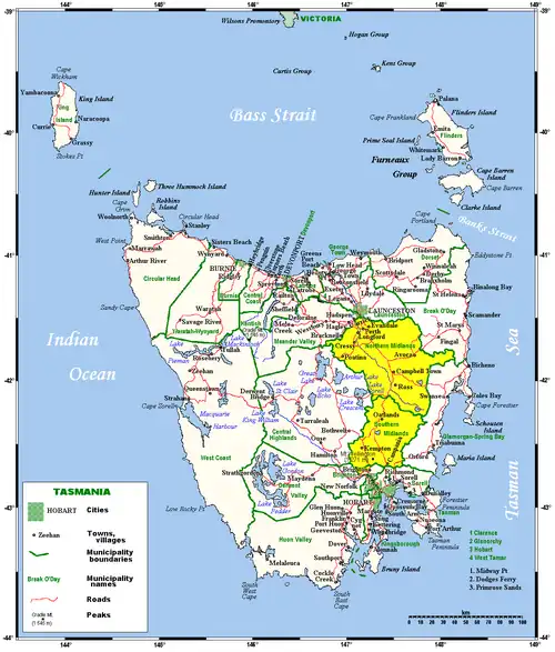 C'est une région relativement plate et sèche allant de Hobart à Launceston, et qui doit d'ailleurs son nom au fait qu'elle occupe la région séparant ces deux villes. Son nom est sans doute aussi influencé par les Midlands au Royaume-Uni.