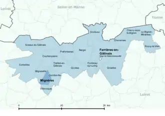 | Ferrières | 1801-2015 | Sous le Consulat, un redécoupage territorial visant à réduire le nombre de justices de paix ramène le nombre de cantons dans le Loiret de 59 à 31[48]. Mignères est alors rattachée par arrêté du 9 vendémiaire an X () au canton de Ferrières[49],[35], qui devient canton de Ferrières-en-Gâtinais en 2001[47]. | ||