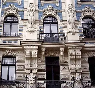 Mikhaïl Eisenstein dessina aussi des immeubles rue Strelkov (aujourd'hui Strelnieku), dont l'un au n° 4 de couleur bleu azur, décoré de délicates statues, est un exemple du raffinement du Siècle d'argent.