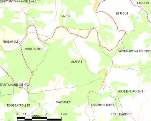 Milhars est limitrophe de huit autres communes dont deux dans le département de Tarn-et-Garonne.
