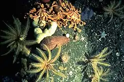 Cet environnement abrite certains organismes en particulier ceux de la zone intertidale, à savoir les étoiles de mer, les anémones de mer, les éponges, les vers marins, les palourdes, les moules, les crustacés prédateurs, les balanes et les petits poissons[7]. Les hydrozoaires, ou hydroïdes, vivent également dans des écosystèmes marins peu profonds et mangent les algues et le zooplancton environnants[8]. Certaines espèces d'isopodes et d'amphipodes se trouvent dans les zones intertidales et créent plusieurs terriers et pistes de surface différents dans les sédiments[9]. Des ophiures ont été vues enfouies dans les sédiments avec leurs bras visibles à travers les sédiments ; ce comportement a été observé dans plusieurs zones marines peu profondes[9].