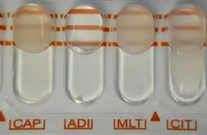 soit le milieu est semi-solide et utilisé dans les galeries API, les cupules de cette dernière contiennent les glucides ou d'autres sources de carbone à étudier. Observer alors la culture dans la cupule (en général dans la zone aérobie de la cupule pour la galerie API20NE).Galerie API 20NE - partie auxanogramme - Pascal FRAPERIE CAP = acide caprique (décanoïque) ADI = acide adipique MLT = acide malique CIT = acide citriqueou dans la galerie API20 C Aux destinée à l'identification des levures, ici Candida albicans: Candida albicans en galerie API20C Aux - S. Droguet