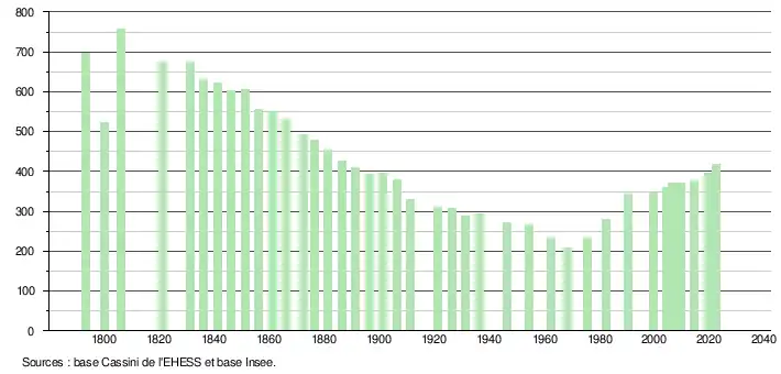 L'évolution du nombre d'habitants est connue à travers les recensements de la population effectués dans la commune depuis 1793. Pour les communes de moins de 10 000 habitants, une enquête de recensement portant sur toute la population est réalisée tous les cinq ans, les populations de référence des années intermédiaires étant quant à elles estimées par interpolation ou extrapolation[13]. Pour la commune, le premier recensement exhaustif entrant dans le cadre du nouveau dispositif a été réalisé en 2004[14].
