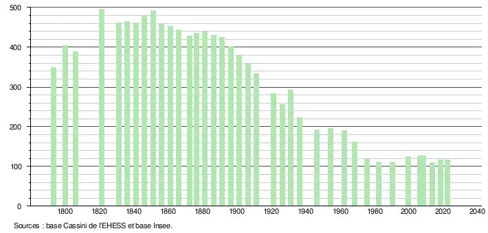 L'évolution du nombre d'habitants est connue à travers les recensements de la population effectués dans la commune depuis 1793. Pour les communes de moins de 10 000 habitants, une enquête de recensement portant sur toute la population est réalisée tous les cinq ans, les populations de référence des années intermédiaires étant quant à elles estimées par interpolation ou extrapolation[15]. Pour la commune, le premier recensement exhaustif entrant dans le cadre du nouveau dispositif a été réalisé en 2008[16].
