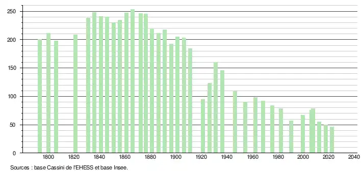 L'évolution du nombre d'habitants est connue à travers les recensements de la population effectués dans la commune depuis 1793. Pour les communes de moins de 10 000 habitants, une enquête de recensement portant sur toute la population est réalisée tous les cinq ans, les populations de référence des années intermédiaires étant quant à elles estimées par interpolation ou extrapolation[26]. Pour la commune, le premier recensement exhaustif entrant dans le cadre du nouveau dispositif a été réalisé en 2007[27].