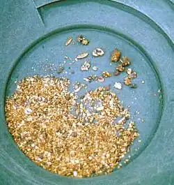 « Paillettes » et « pépites » d'or dans une batée (Alaska).