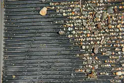 Le fond de la boîte était constitué d’une série de radiers disposés de manière à créer des zones de moindre courant où se déposaient les particules d’or plus lourdes que le reste des matériaux.