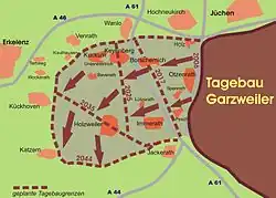 L’extraction de lignite entreprise par la filiale RWE Power AG de la firme RWE AG (anciennement Rheinbraun — lignite se disant en allemand Braunkohle) n’a eu lieu jusqu’ici que dans la première des deux sections prévues, Garzweiler I et II. Garzweiler I comprend l’étendue située à l'est de l'autoroute fédérale 44, tandis que le site d’exploitation Garzweiler II correspond à un secteur à l'ouest de l'A 44 ; ce dernier, grand de 48 km2, est nettement plus vaste. Le , le gouvernement du Land de Rhénanie-du-Nord-Westphalie donna son aval à la mise en œuvre du Braunkohleplan Garzweiler II. Aussi les excavatrices purent-elles, le , entamer cette nouvelle zone. Sont concernés à présent, pour la première fois, et à hauteur de 40 km2, des portions de territoire de la ville d’Erkelenz (arrondissement de Heinsberg). Un tiers environ de la superficie de cette ville sera mis à contribution. 6,5 km2 sont situés sur le territoire de la commune de Jüchen et 1,5 km2 environ sur le territoire de la ville de Mönchengladbach, laquelle sera donc pour la première fois elle aussi impliquée dans ce projet minier.