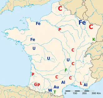 Ressources naturelles de France: Al — Aluminium, Fe — Fer, W — Tungstène, Au — Or, U — Uranium, C — Charbon, L — Lignite, P — Pétrole, G — Gaz naturel, F — Fluorine, K — Potasse, T — Talc.
